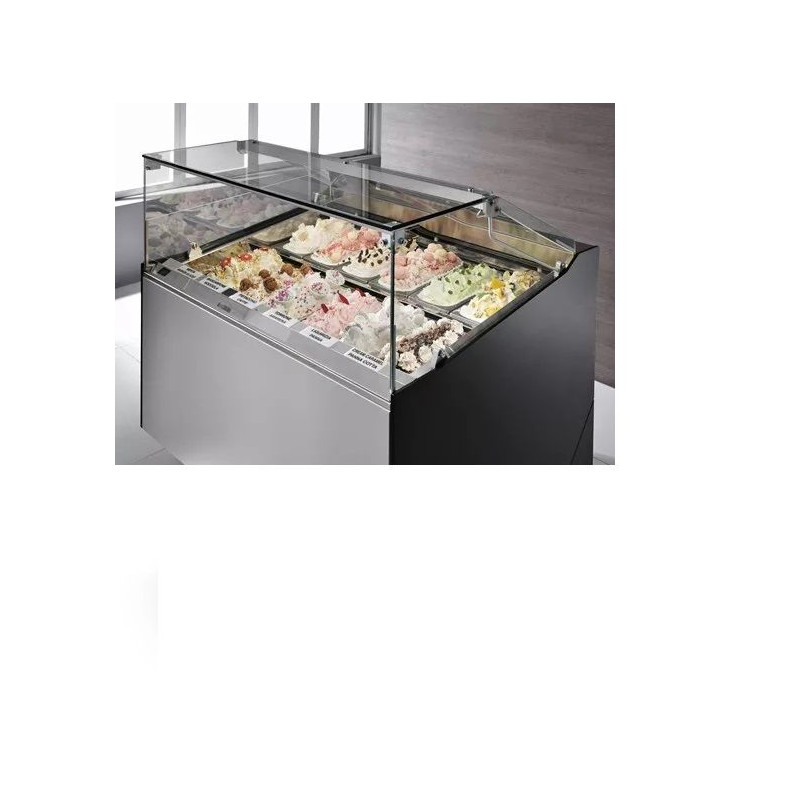 MYA 2 Ice-cream showcase | mm L 1150 - (12 flavors) P1260 H1367 |Tubolar structure in R35660 painted s/s | Molded heat-insulated tank with rounded internal edges coated by AISI 304 s/s | Pre-arrAngement for of lt.5.2 s/s pans dim. mm.360x165x120h (not included) | S/s flavour labels with back-lighting | Fan ventilated refrigeration with double air flow system | Automatic reverse defrost cycle | Digital control panel | Brushed s/s working top | Tempered lift-up front double glass with pyrolytic anti-fog treatment | Double glass sides with aesthetic anti-fog warming system | Aluminium profiles. brillant finiture | Operator side closure with plexiglass sliding panels | LED lighting system | BUILT-IN COMPRESSOR