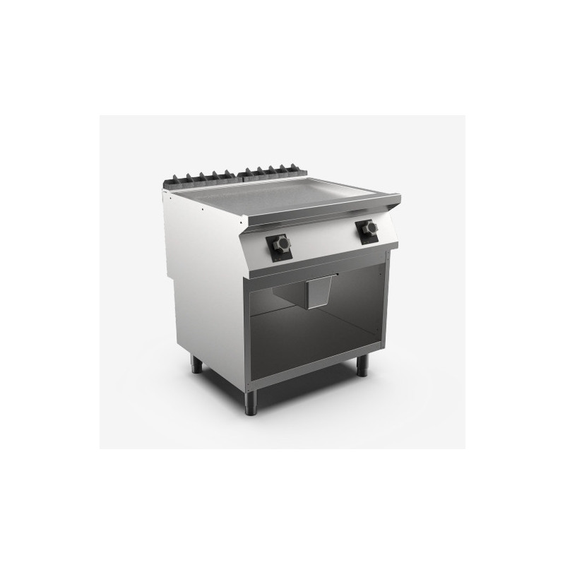 Electric fry-top on open cabinet, made of AISI 304 stainless steel. Pressed top, 20/10 thickness, with anti-spill front edge, designed for flush alignment with the supplied hermetic seal. Top prepared for mounting a water column accessory. Cooking surface with inclined plate, smooth ChromePlus with ultra-resistant brushed chrome finish, easy to clean. Cooking plate lowered by 40 mm compared to the worktop, hermetically sealed to facilitate cleaning. Cooking surface with a cold zone of 65 mm at the front of the plate. Circular grease drain hole Ø 40 mm. GN grease collection container installed in the lower compartment to facilitate and increase liquid recovery capacity. Heating by Incoloy armoured resistances. Heating control knob shaped to protect against water infiltration, equipped with integrated indicator lights that immediately signal heating and correct operation of the appliance. Cooking temperature controlled by thermostat adjustable from 110 to 280 °C. Safety thermostat intervenes in case of service thermostat failure. Cooking surface 735x700 mm. Includes: scraper for smooth plate. Protection level IPX5. The product complies with Regulation EC 1935/2004 and Decree of 21/03/1973 (Materials and Articles intended to come into Contact with Food). Water protection rating IPX5. Appliance fitted with height-adjustable stainless steel feet.