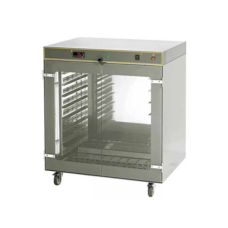 Description The proofer EP 800 is a heating chamber to make the dough rise in 2 hours at 29 ° C. The steam injection is automatically preset in time and in quantity. The bakery ovens FC 100 EG and FC 110 E can be fixed on the stainless steel proofer for a bakery station with minimum space! Features: on / off switch, electronic thermostat, filling solenoid valves, pilot light, push button for steam injection, stainless steel water collection tank. Oven mounted on 4 wheels with brake system. Delivered without grid.