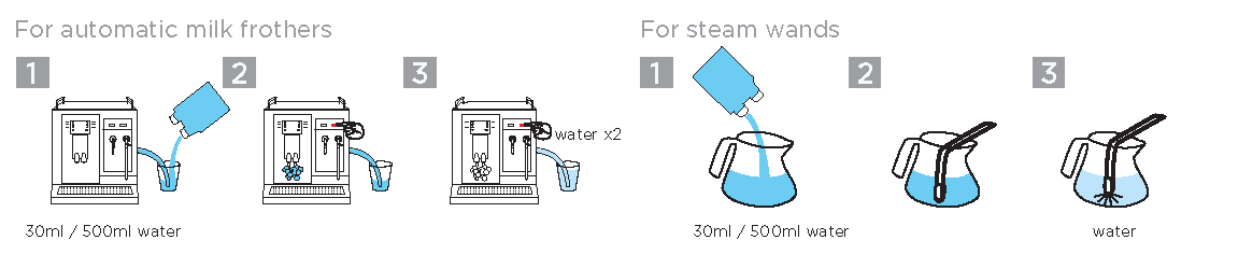 - Cleans milk lines of auto-frothers and traditional steam wands and steel pitchers